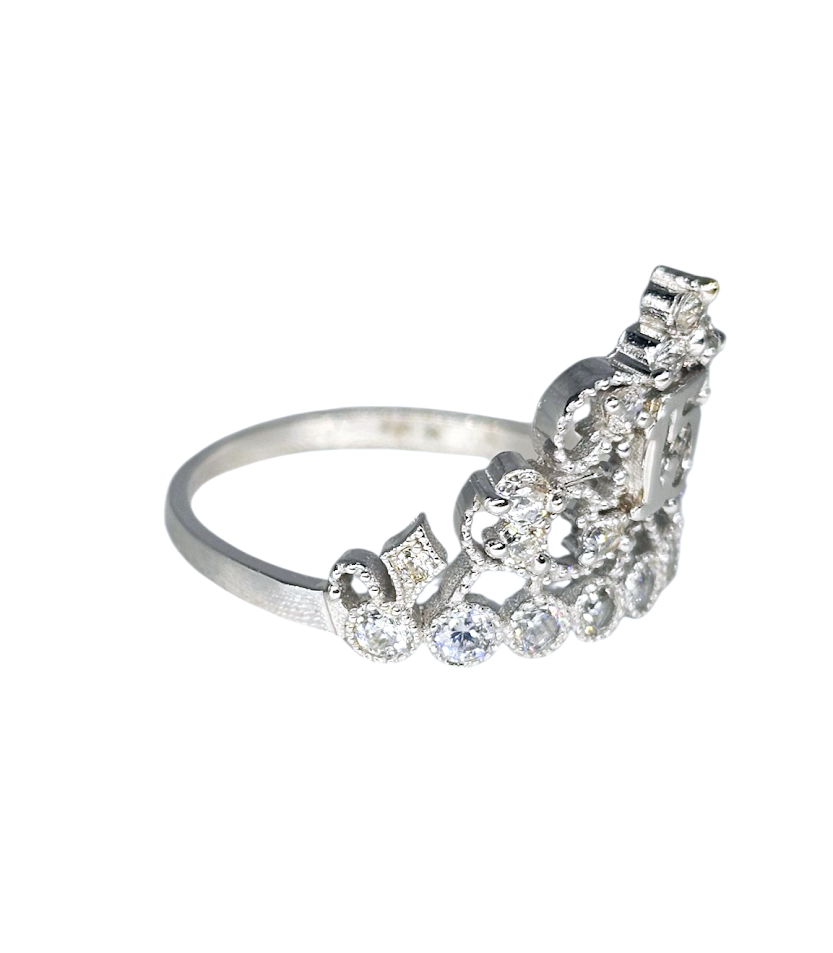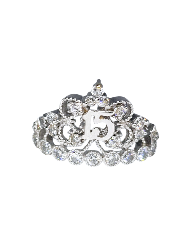 Sortija de Corona con 15 en oro Blanco con zirconia, 1.6dwt, 2.4g